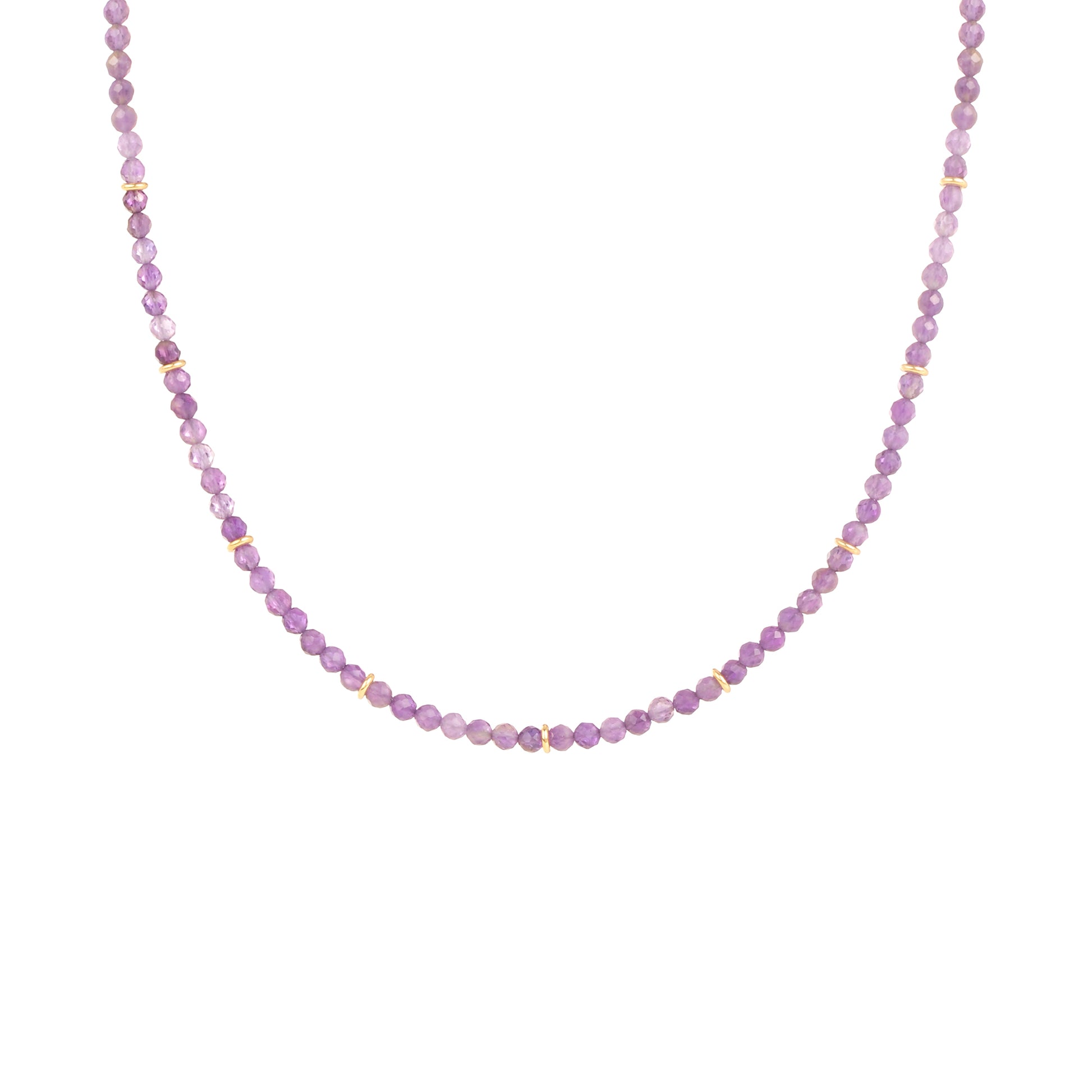 Le collier améthyste est composé de perles rondes facettées en améthyste et de petites anneaux lisses en laiton doré.
