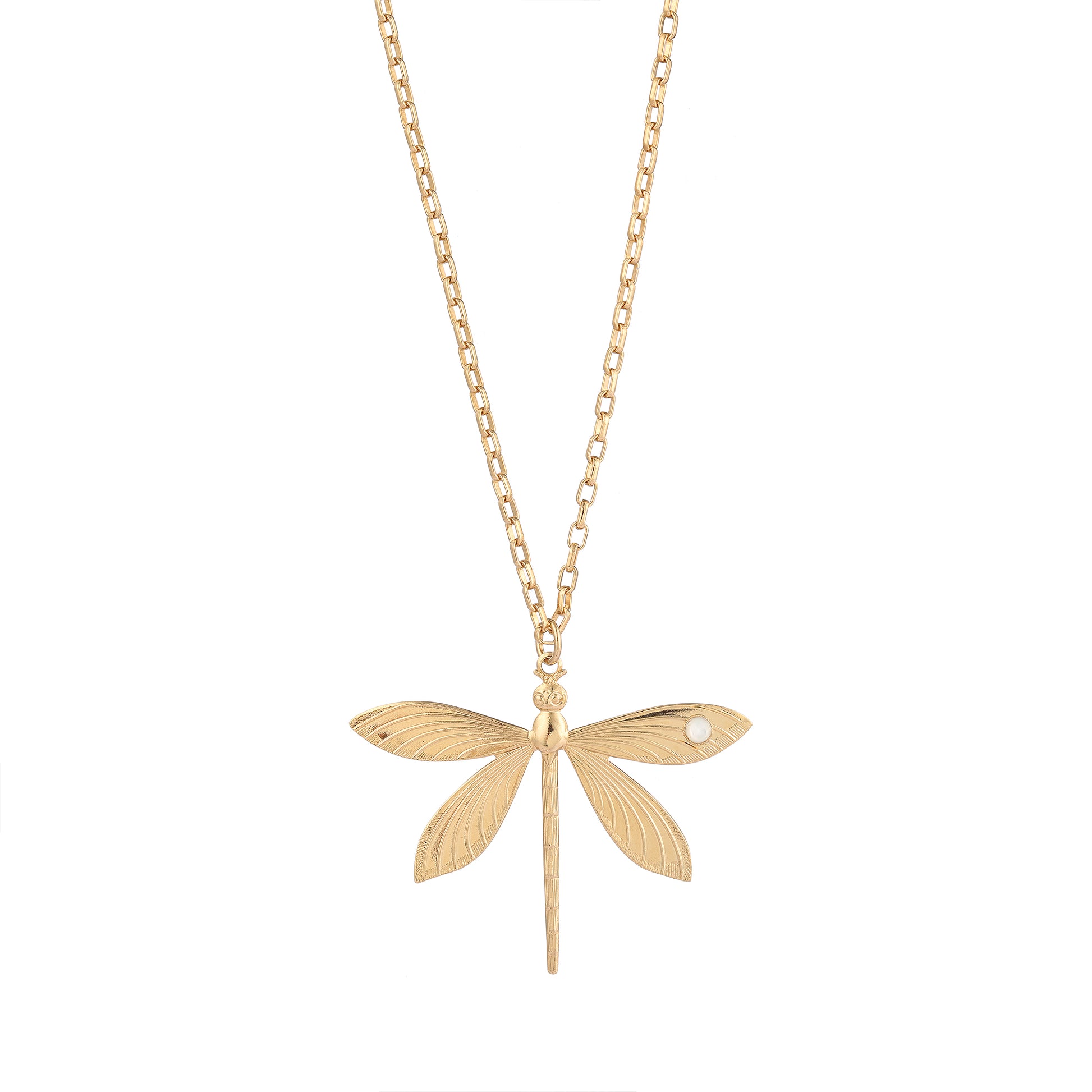 Sautoir composé d'une chaine et d'un pendentif en forme de libellule. Un cabochon en nacre orne son aile droite
